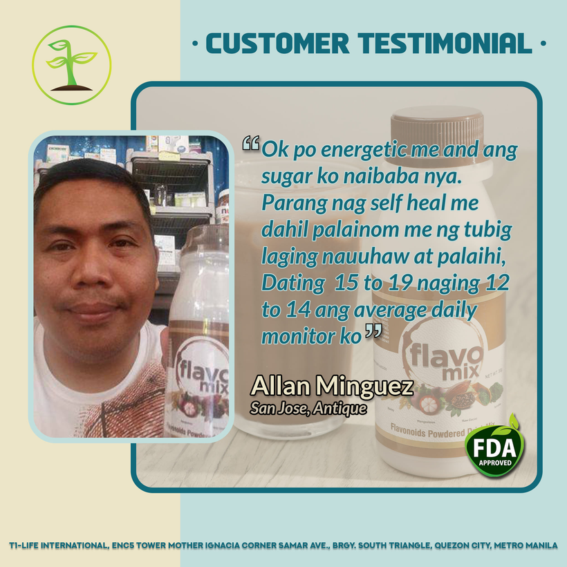 “Apat na araw ako sa ICU, pang 7th day nagising ako. Uminom ako ng Flavo Mix at after 2 months, bumaba na ang blood sugar level ko.”
